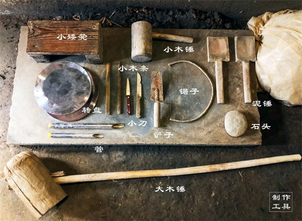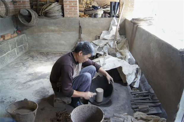1. 選泥與打泥:制作土鍋子首先選用粘性較好的膠泥,加入細沙和水攪拌,然后用石錘使勁錘打,此為“打泥”,打好的泥