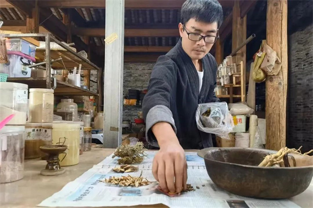 在騰沖搟香的傳承之路上,黃枝超是一位青年技藝代表人物。作為琦瑋香料制造坊的主理人,他是騰沖搟香技藝的第五