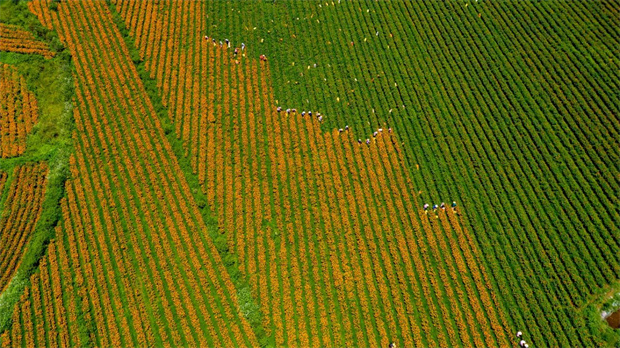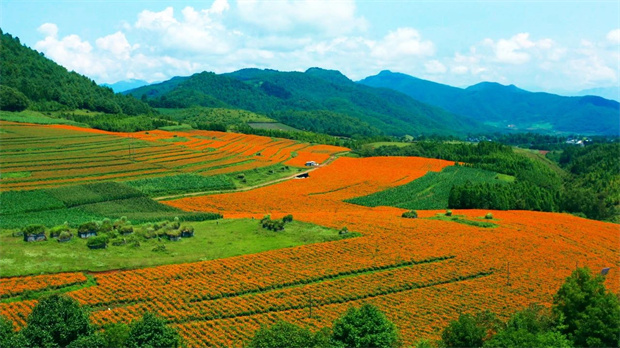 萬壽菊順著山勢(shì)從山腳漫到山腰