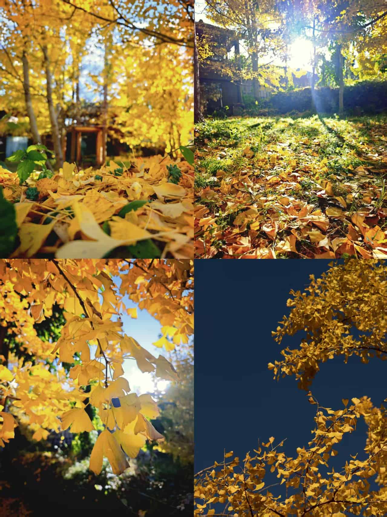 抓拍村民掃落葉的「金色雨簾」動(dòng)態(tài)(用0.9倍廣角+連拍)。