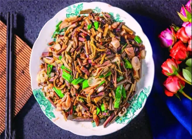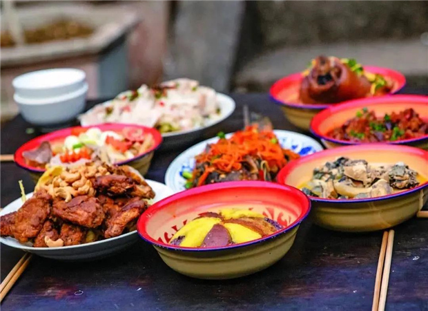 在騰沖宴席中,影響大者,首推“八大碗”?!鞍舜笸搿痹隍v沖地方史志資料中稱為“八簋”?!绑睘楣糯尘?,通體圓形,肚大,口底略收。由此可知“八大碗”歷史久遠(yuǎn),聲名赫赫。騰沖“八大碗”食材多樣,內(nèi)容豐富。有葷有素,有甜有咸,有熱有冷,有香有脆,有湯有羹。做工精細(xì),搭配講究,可調(diào)眾口,可飽眾腹,實為騰沖飲食的代表作。