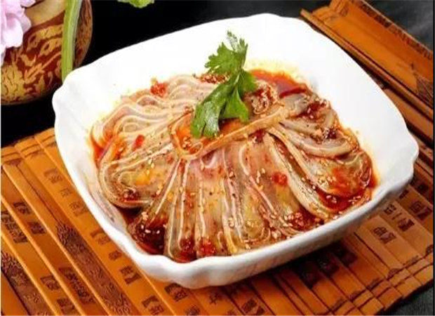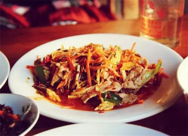 大薄片已成為滇西名菜,工于火候,長于刀法。用特制的豬頭肉片成薄如蟬翼的大片,調(diào)料齊全,具有咸、酸、辣、麻、香多種滋味,肉脆嫩,嚼時有勁,回味無窮。