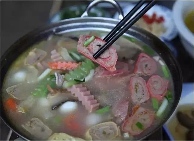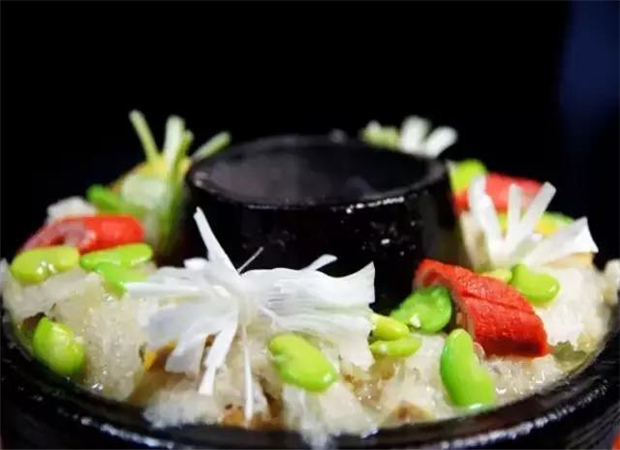 騰沖待客席面八大碗中,最具有特色的菜肴,工序復雜。首先是豬蹄筋,先晾干,用水泡開,沒條件的用豬皮來代替,之后再放入鵪鶉蛋、萵筍、胡蘿卜、蛋卷、百合、瘦肉片、肉圓丸子、香菇、白蕓豆等。該菜所含的配料,堪稱“全家?!?,吃起來味美鮮爽。