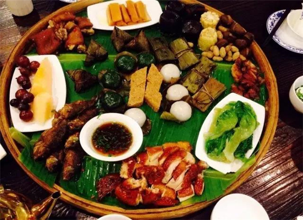 簸箕內(nèi)使用新鮮芭蕉葉盛放食物,菜品豐富誘人:有糍粑、檸檬雞、木桶豬手、油煎禾花魚、原味叉燒、雜糧飯、水果…….葷素搭配、湯齊料足真是一個都不少!