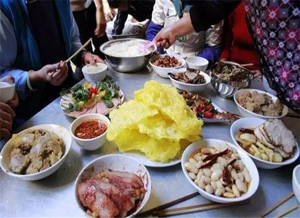 簸箕宴是云南少數(shù)民族流傳至今的一種手抓飯習俗,大家圍坐在大簸箕邊,邊吃邊談、邊欣賞歌舞表演,其樂無窮。