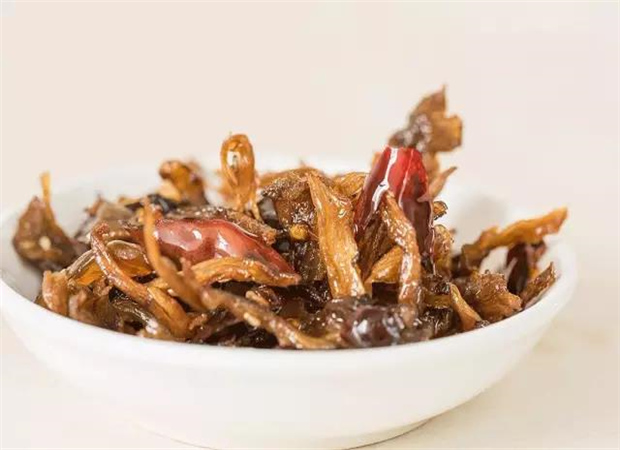 油菌子是采用新鮮菌菇、用菜籽油加各種調(diào)料小火慢熬而成,成品少,耗時長,但口味鮮香,佐飯或是面食都極好!而且由于菌子里的水分都被油慢慢熬出,所以油菌子能儲存很長一段時間,是一種可以帶回家的騰沖美食!